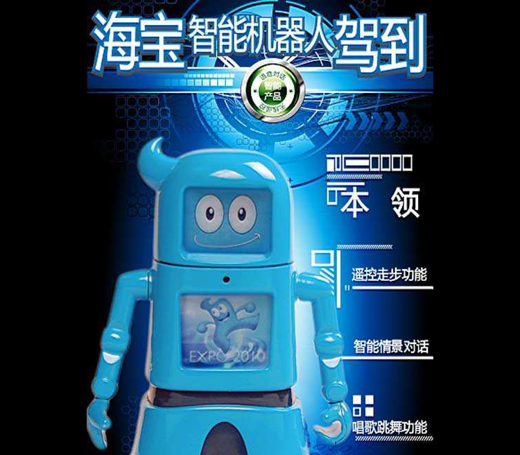 集眾多本領(lǐng)于一身的袖珍版海寶智能機(jī)器人除了會(huì)遙控走步之外,更能與消費(fèi)者交流對(duì)話,這是新世傲專(zhuān)為世博會(huì)設(shè)計(jì)的服務(wù)型海寶機(jī)器人的袖珍版。